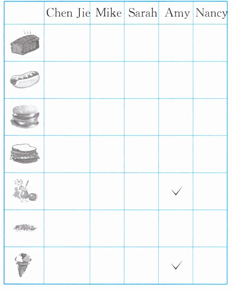 | | Chen Jie | Mike | Sarah | Amy | Nancy |
