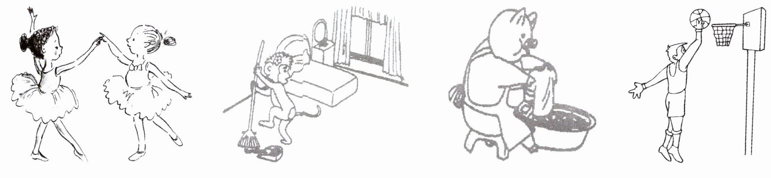 1. dance 2. clean the room 3. wash the clothes 4. play basketball