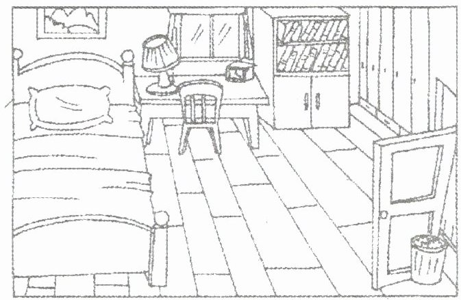 1. There are many pictures here. 2. Where is the ball? 3. There are lots of flowers in it. 4. This is the living room. 5. It is in front of the dog. 6. I see a photo above the bed. 7. There is a basketball behind the door.