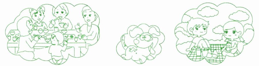 请根据图片提示,以“Our weekends”为题,写一写你和你的家人在周末做些什么。
