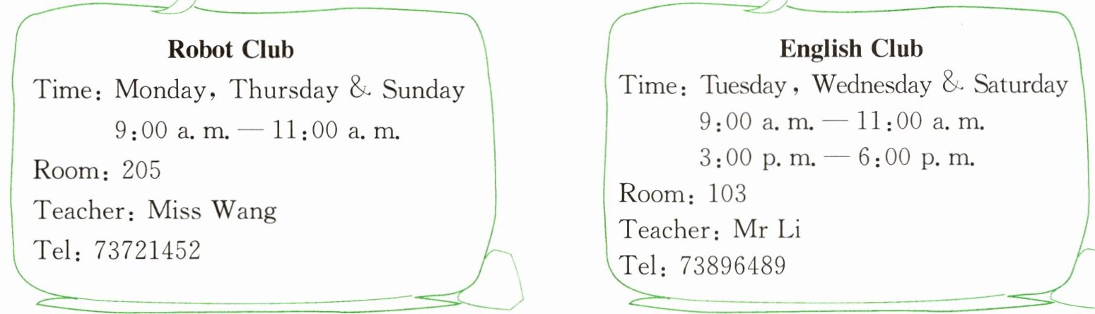 ) 4. Bob stays in the club from 3:00 p. m. to 5:00 p. m. every Saturday. So he is in ________.A. Art Club B. English Club C. Robot Club