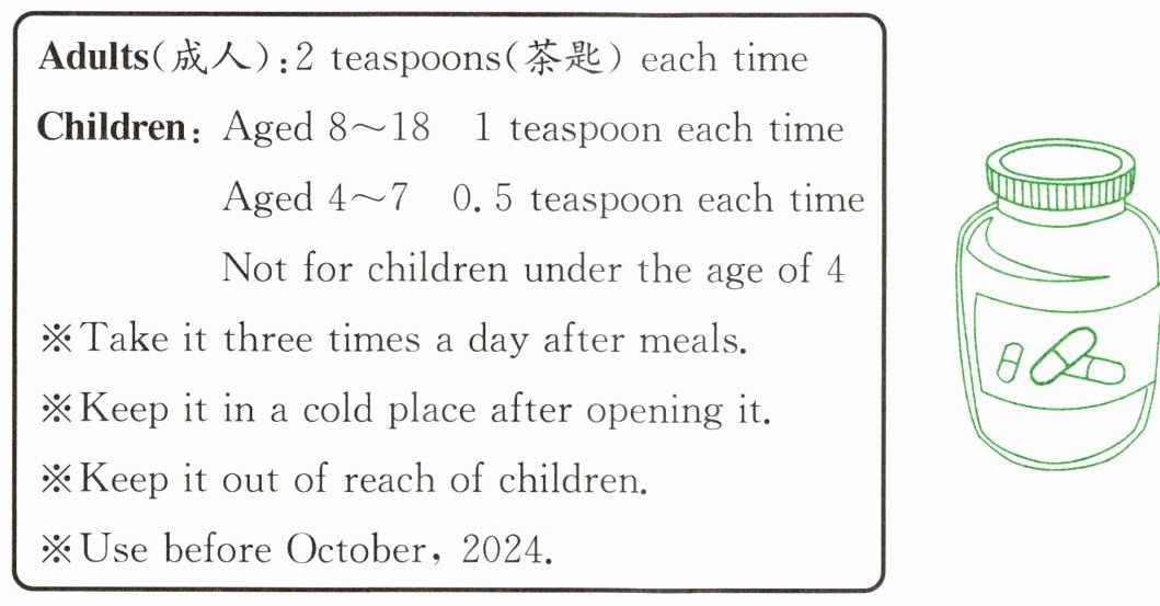 Linda is 13 years old. She has a fever today. She goes to see the doctor. The doctor gives her some medicine. Here is the medicine instructions(说明).