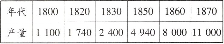 材料二 1800—1870 年英国煤产量统计表(单位:万吨)。