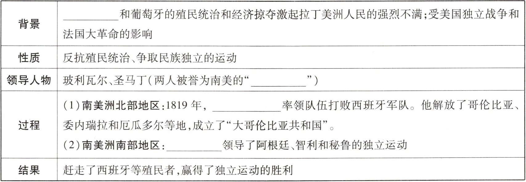 |领导人物|玻利瓦尔、圣马丁(两人被誉为南美的“______”)|