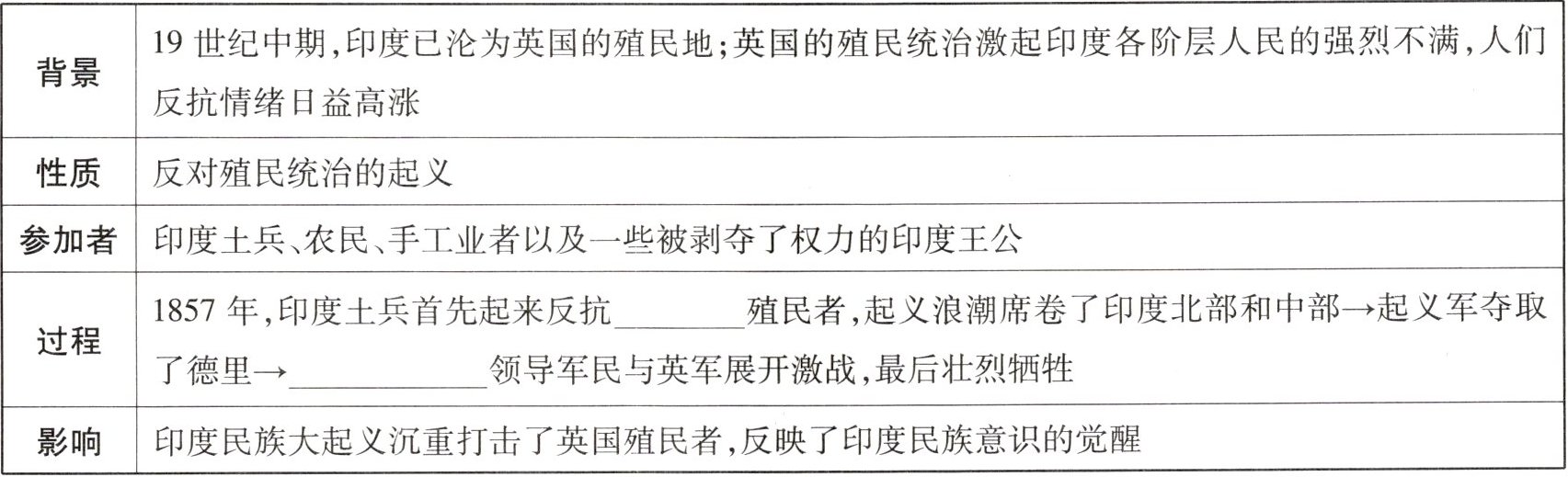 |过程|1857年,印度土兵首先起来反抗______殖民者,起义浪潮席卷了印度北部和中部→起义军夺取了德里→______领导军民与英军展开激战,最后壮烈牺牲|