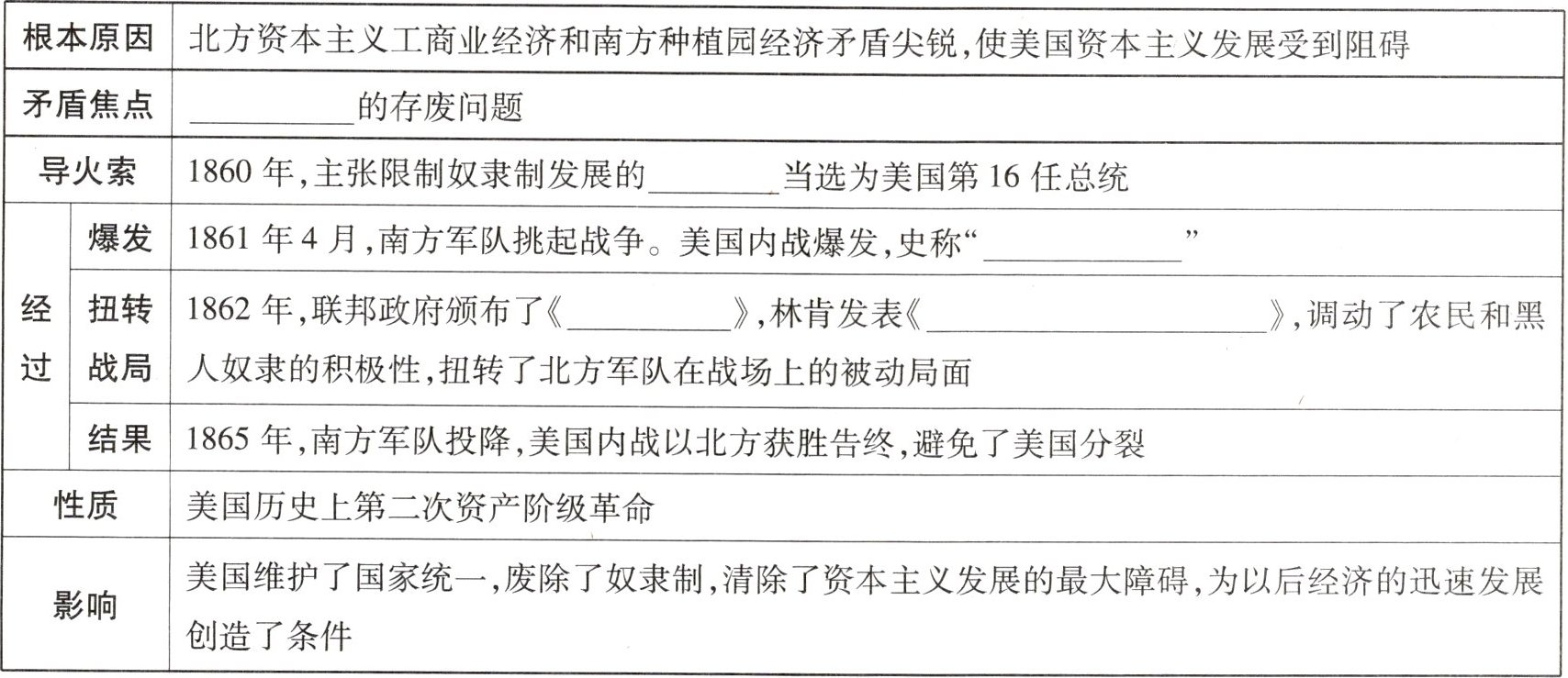 | |结果|1865 年,南方军队投降,美国内战以北方获胜告终,避免了美国分裂|