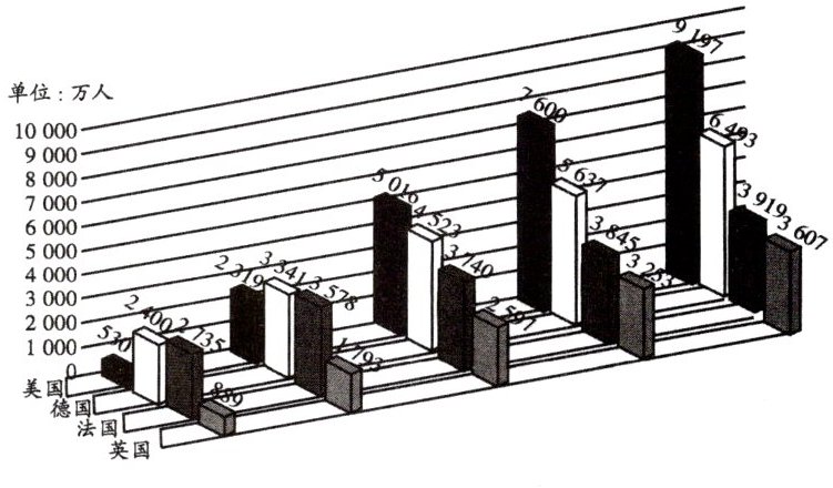 (1)不断增长。工业革命极大地推动了生产力的发展,促进了人口的迅速增长。美国人口增长较快,逐渐超过德国、法国、英国的人口。