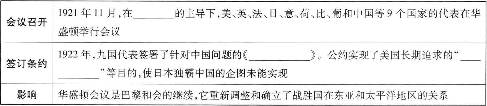 |签订条约|1922 年,九国代表签署了针对中国问题的《______》。公约实现了美国长期追求的“______”等目的,使日本独霸中国的企图未能实现|
