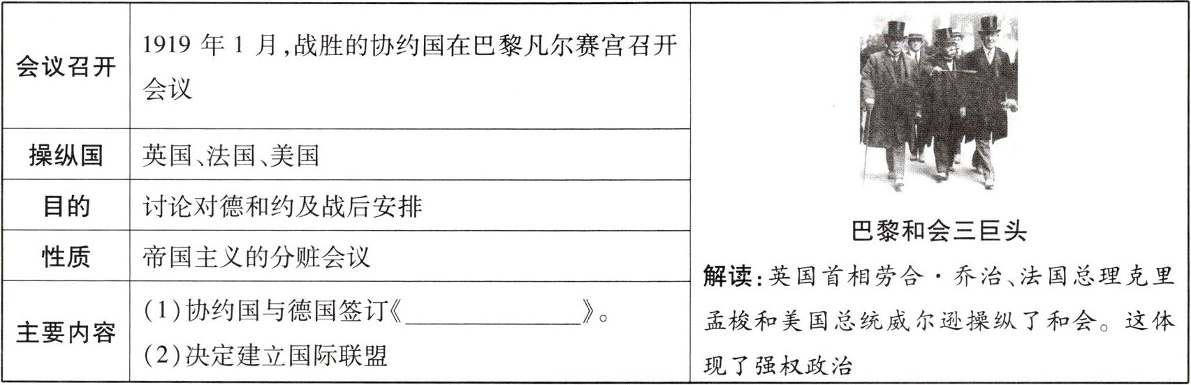 解读:英国首相劳合·乔治、法国总理克里孟梭和美国总统威尔逊操纵了和会。这体现了强权政治