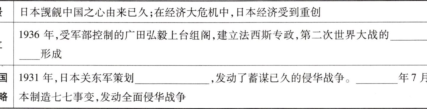 |对中国的侵略|1931 年,日本关东军策划____,发动了蓄谋已久的侵华战争。____年 7 月 7 日,日本制造七七事变,发动全面侵华战争|