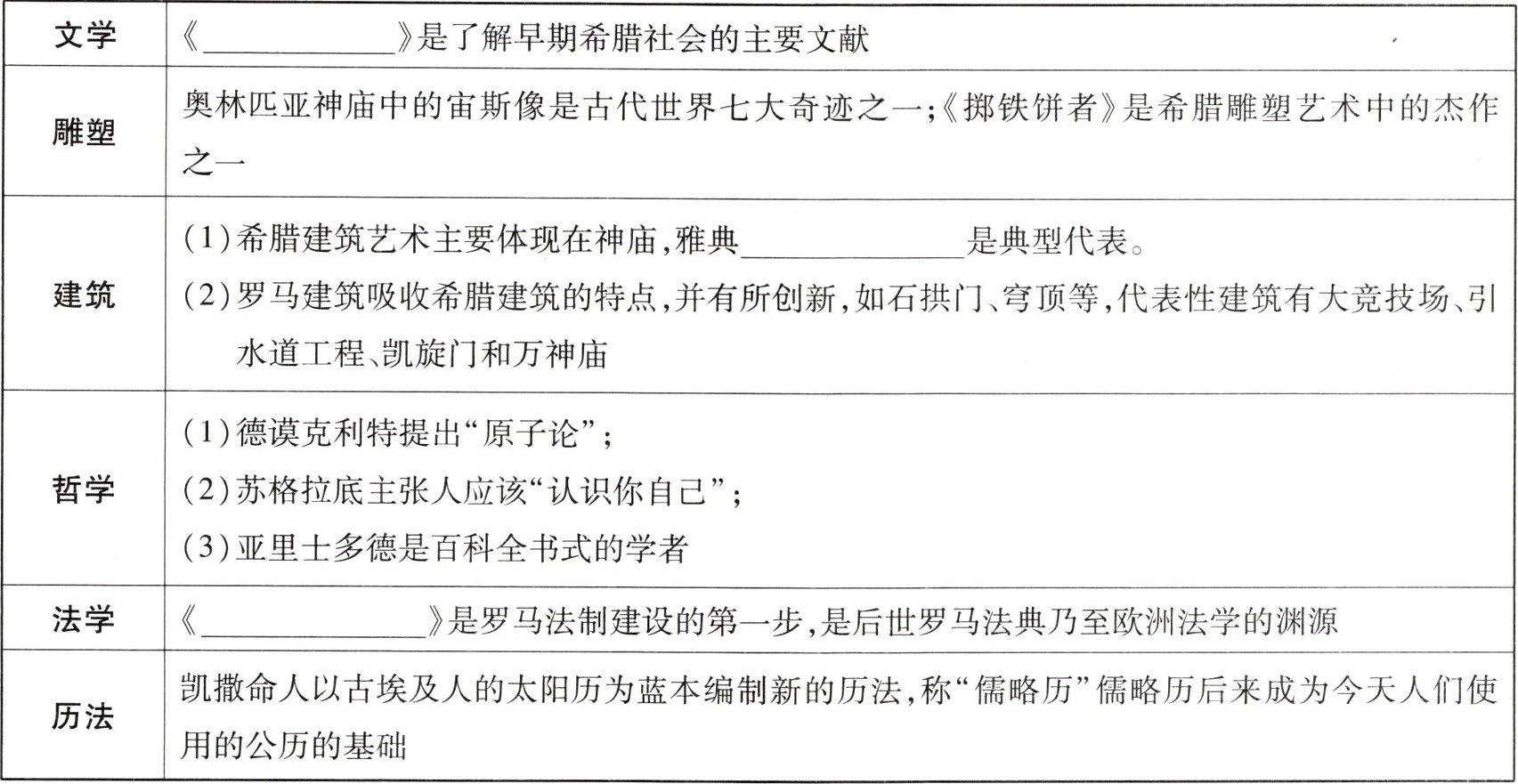 (2)罗马建筑吸收希腊建筑的特点,并有所创新,如石拱门、穹顶等,代表性建筑有大竞技场、引水道工程、凯旋门和万神庙|