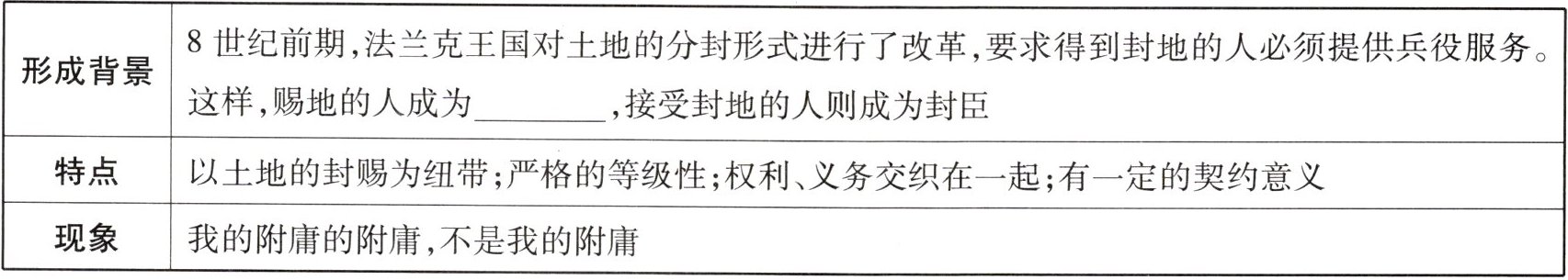 |考点3 封君与封臣|形成背景:8世纪前期,法兰克王国对土地的分封形式进行了改革,要求得到封地的人必须提供兵役服务。这样,赐地的人成为______,接受封地的人则成为封臣