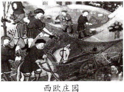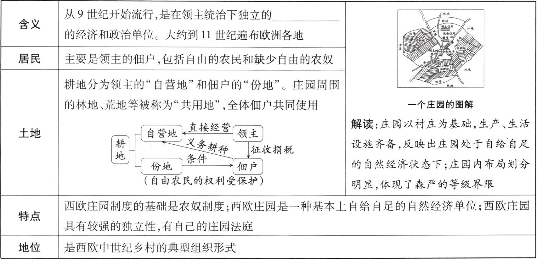 解读:庄园以村庄为基础,生产、生活设施齐备,反映出庄园处于自给自足的自然经济状态下;庄园内布局划分明显,体现了森严的等级界限|