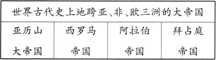 4. (2023·湖南怀化)小明同学在归纳世界古代史上地跨亚、非、欧三洲的大帝国时,罗列了四个国家(见下表)。