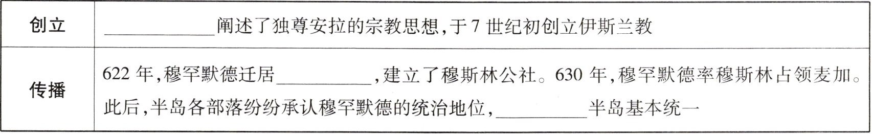 |考点1 穆罕默德创立伊斯兰教|创立:______阐述了独尊安拉的宗教思想,于7世纪初创立伊斯兰教