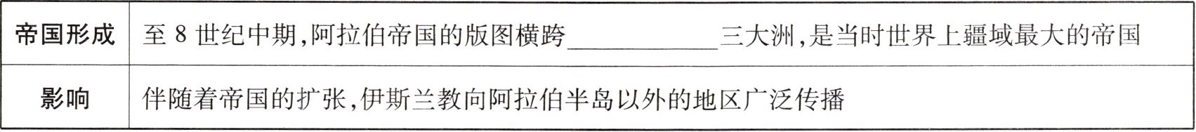 |考点2 阿拉伯帝国|帝国形成:至8世纪中期,阿拉伯帝国的版图横跨______三大洲,是当时世界上疆域最大的帝国