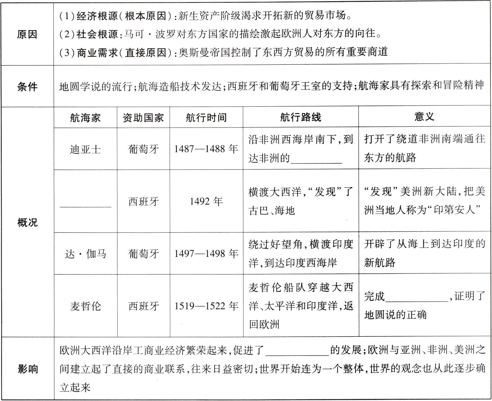 表格填空答案依次为:好望角;哥伦布;环球航行;资本主义。