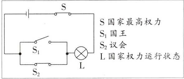 5. (2023·四川宜宾)跨学科 物理 物理科代表巧用电路图表示 17 世纪后期某国家最高权力的转移(如图:打开$ S_1,$闭合 S、$S_2,L $灯亮)。其意指( )