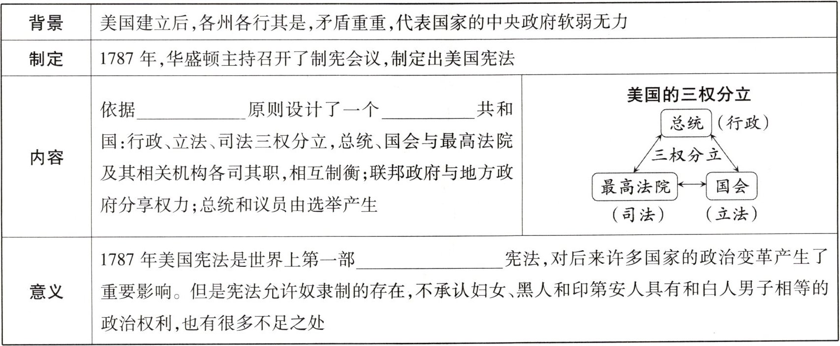 |内容|依据____原则设计了一个____共和国:行政、立法、司法三权分立,总统、国会与最高法院及其相关机构各司其职,相互制衡;联邦政府与地方政府分享权力;总统和议员由选举产生|