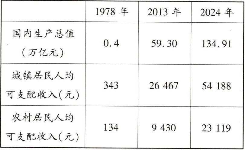 7. 我国国内生产总值从改革开放之初的3679亿元增长到2024年的134.91万亿元,稳居世界第二位;打赢了人类历史上规模最大的脱贫攻坚战,历史性地解决了绝对贫困问题,如期全面建成小康社会。下列选项中最能概括以上材料内容的是( )
