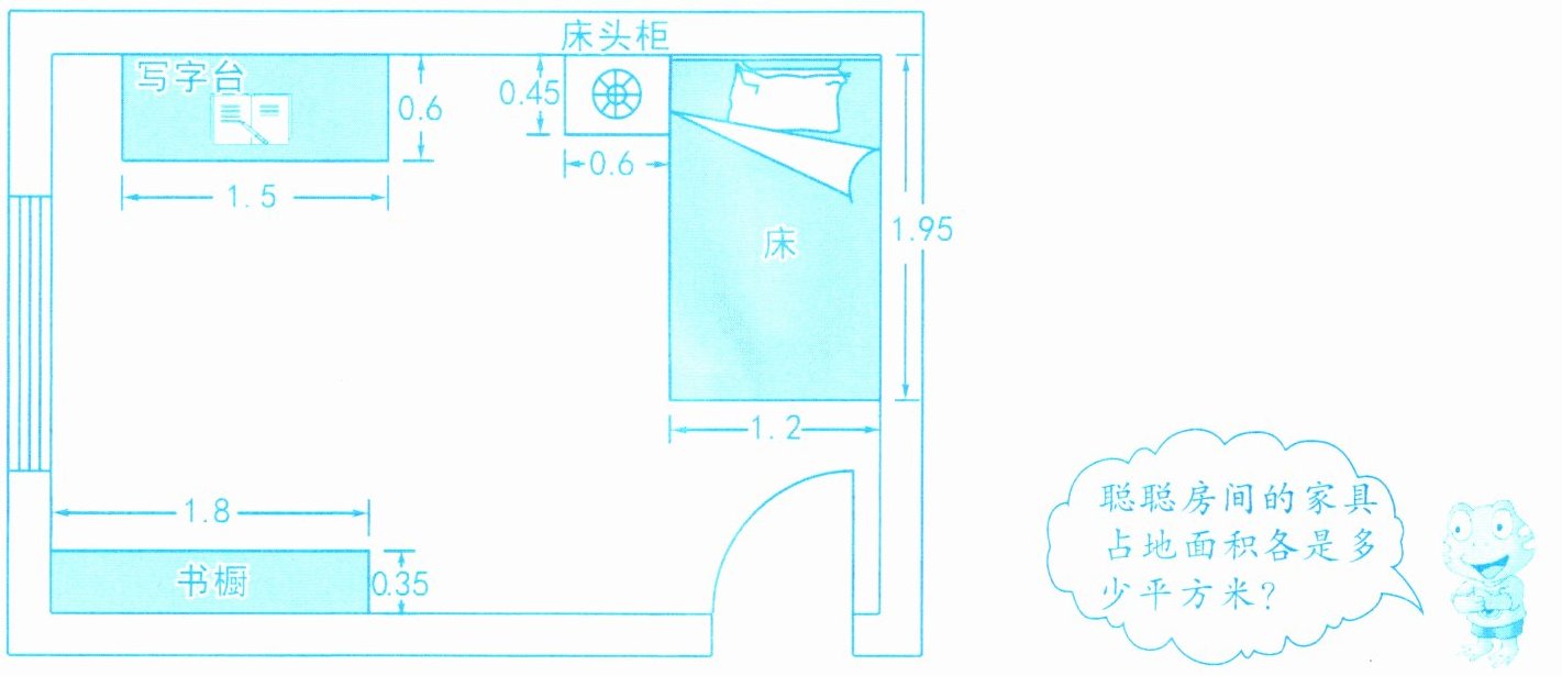 答案为:聪聪房间的写字台占地面积是0.9平方米,床头柜占地面积是0.27平方米,床占地面积是2.34平方米,书橱占地面积是0.63平方米。