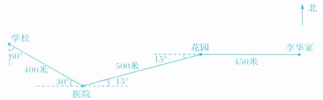 (1)观察路线图可知,李华家在图的最右侧,学校在图的最左侧。李华上学从家出发,根据图中方向标“上北下南,左西右东”,先向西走$450$米到花园;再从花园向西北$15^{\circ}$走$500$米到医院;最后从医院向北偏西$60^{\circ}$走$400$米到学校。