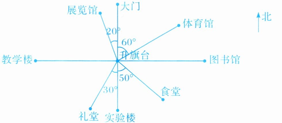 (3)食堂在升旗台的东偏南$50^\circ$方向(或南偏东$40^\circ$方向 )。
