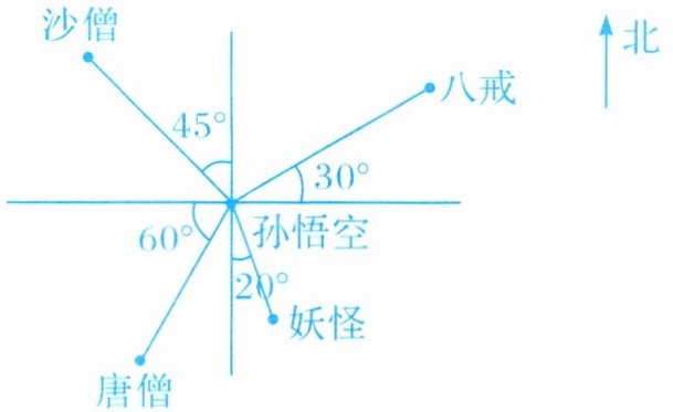 解析:本题主要考查了根据方向和角度确定物体的位置。需要根据图中所给的方向标(上北下南,左西右东)以及各人物与孙悟空之间的角度关系来填空。