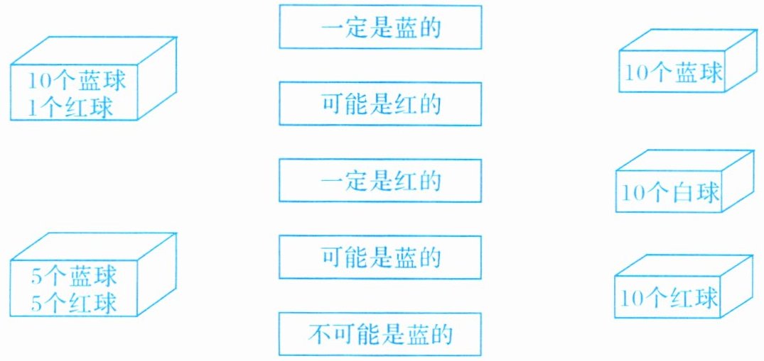 “5个蓝球5个红球”的盒子:盒子里有蓝球和红球两种球,所以摸出的球可能是蓝球,也可能是红球。