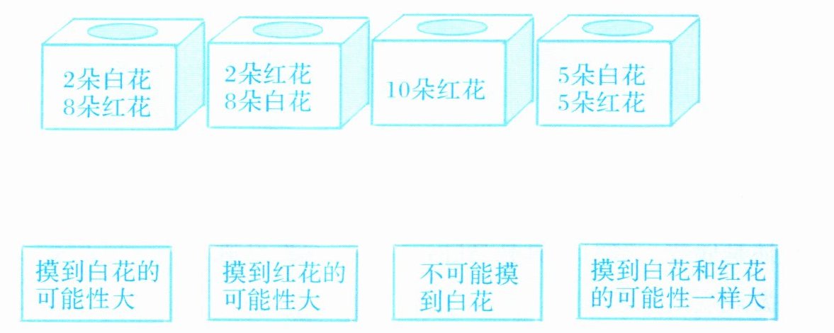 摸到白花的可能性大 摸到红花的可能性大 不可能摸到白花 摸到白花和红花的可能性一样大