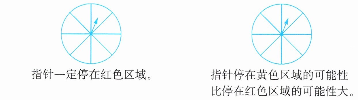 第二个圆盘:指针停在黄色区域的可能性比停在红色区域的可能性大,那么黄色区域的面积要大于红色区域的面积。