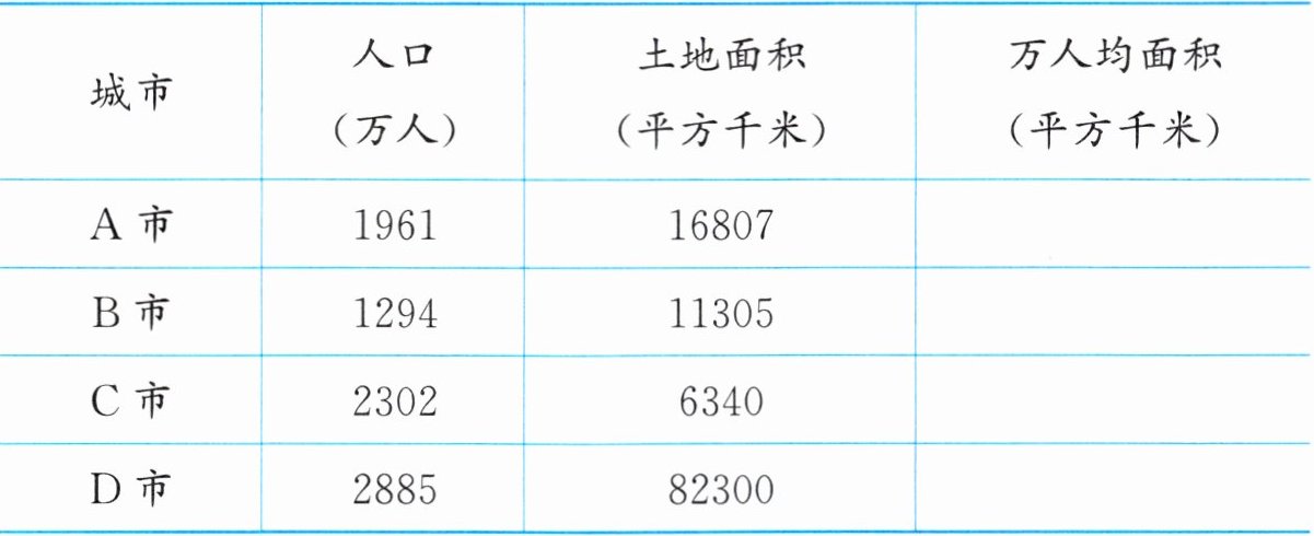 | 城市 | 人口(万人) | 土地面积(平方千米) | 万人均面积(平方千米) |
