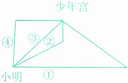 4. 小明要去少年宫,有四条路可以走,请你告诉小明走哪条路最远,走哪条路最近。(5分)