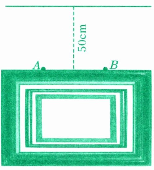 3. 要把一个相框水平地挂在墙上,如下图所示,使相框距离天花板50厘米。应该怎样在墙上钉上钉子A和B,才能满足要求?简单说说你的理由。(5分)