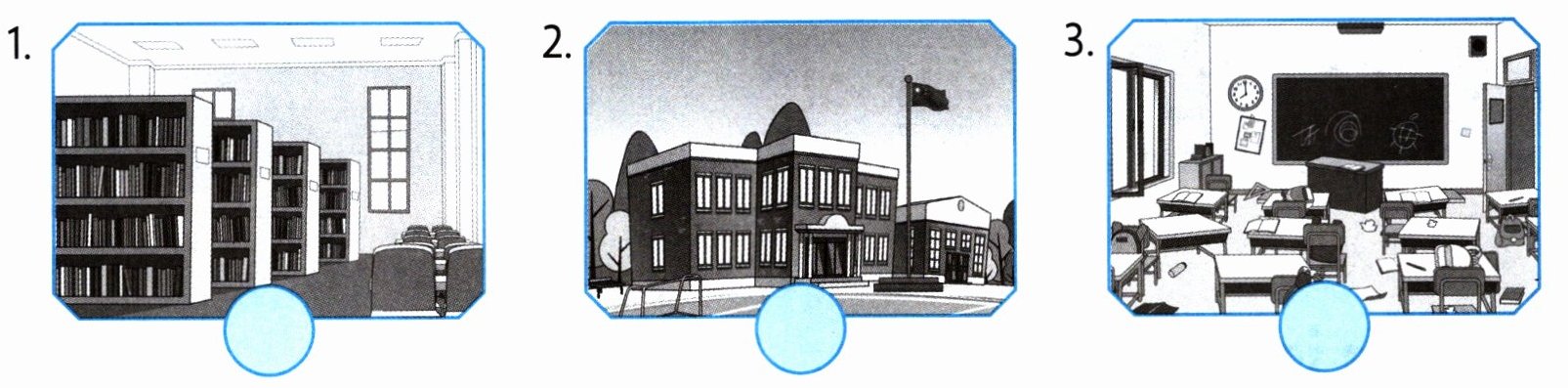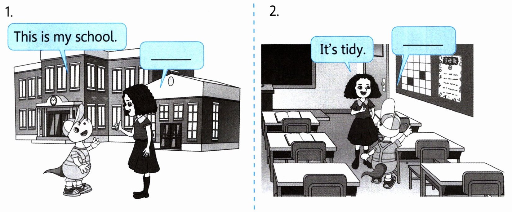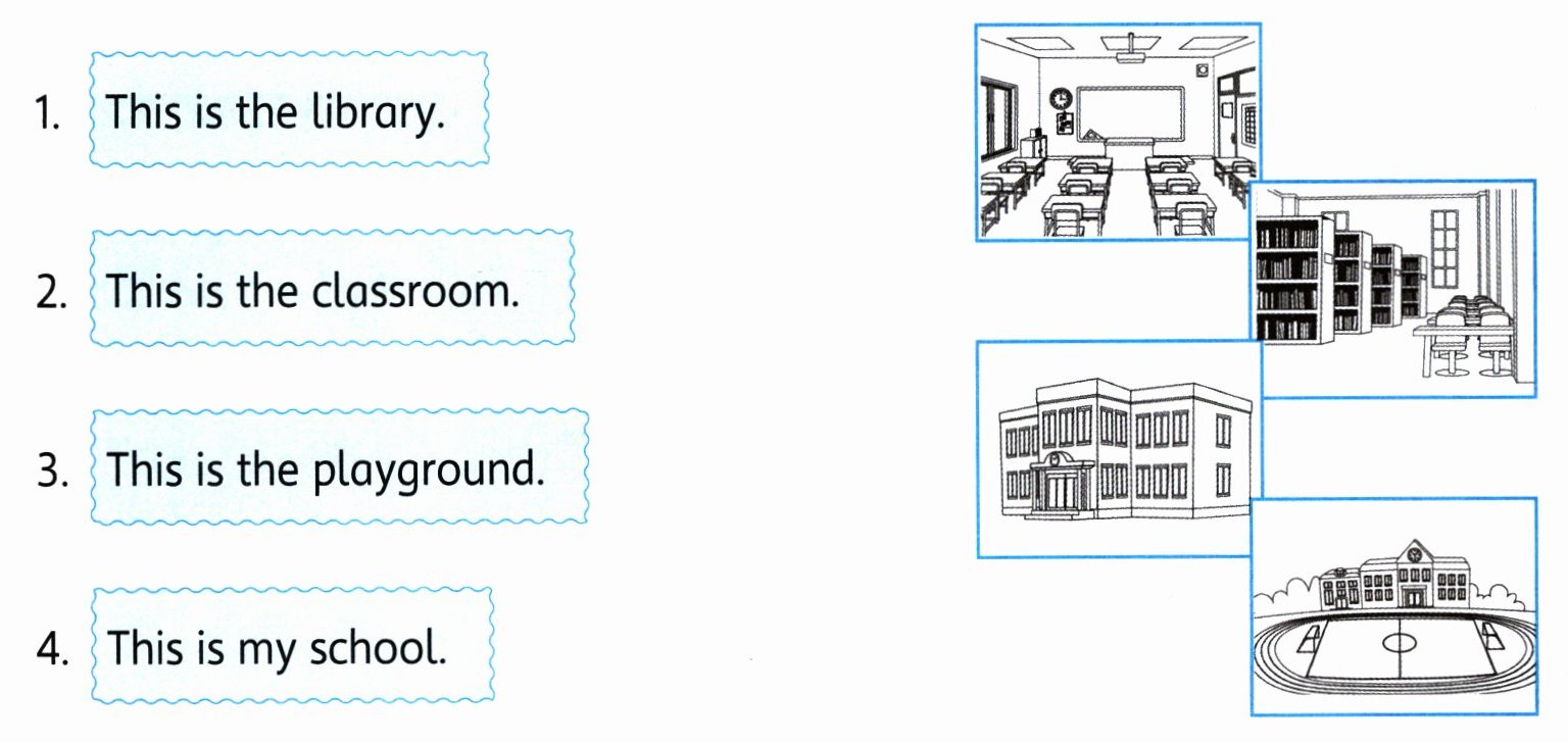 1-有书架的房间图;2-有桌椅黑板的房间图;3-有跑道的操场图;4-学校建筑图