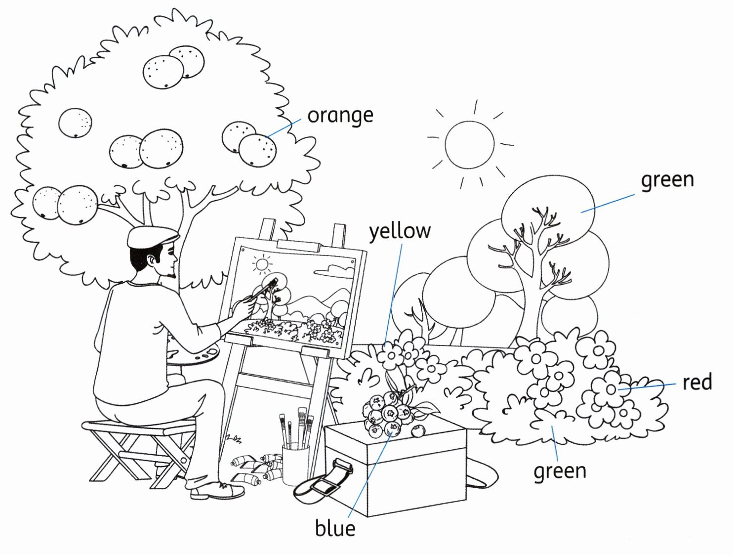 将图中标注“orange”的果实涂成橙色,标注“green”的树叶涂成绿色,标注“yellow”的花朵涂成黄色,标注“red”的花朵涂成红色,标注“blue”的颜料盒涂成蓝色,太阳涂成黄色。