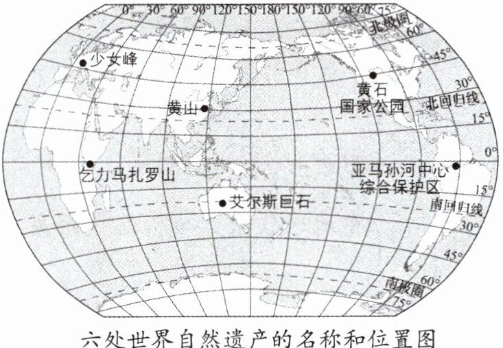 世界自然遗产遍及世界各地。保护自然遗产,让人们领略大自然的鬼斧神工,也为地理学家探索大自然的奥秘创造了必要的条件。右图显示了六处世界自然遗产的名称和位置。据此完成4—5题。