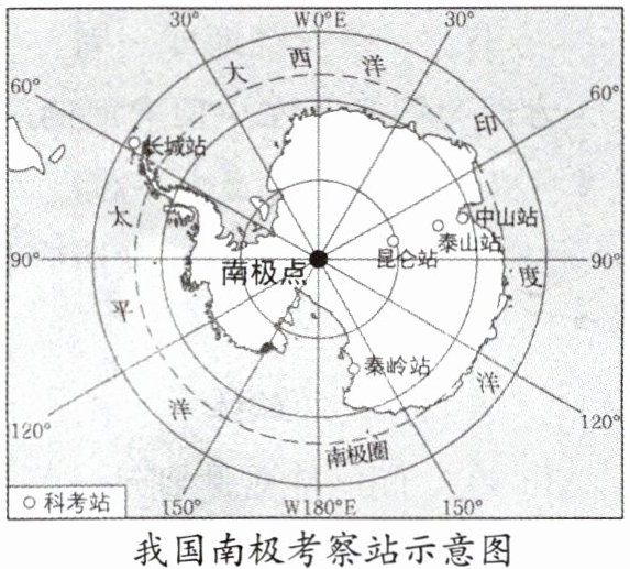 A选项,根据图中经度判断,长城站位于$60^{\circ}W$附近,秦岭站位于$163^{\circ}E$附近,$160^{\circ}E$以东为西半球,故秦岭站也位于西半球,说法错误。