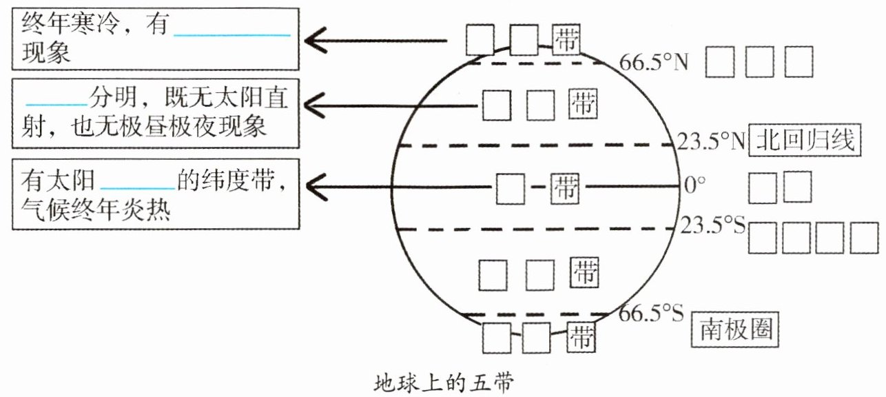 (2)五带概况。在下图中右侧空方框内填注:赤道、北极圈、南回归线。在图中相应位置填写五带的名称,再用红色表示热带范围,用蓝色表示寒带范围,用阴影表示温带范围,并在左侧填出热带、温带和寒带的地理意义。