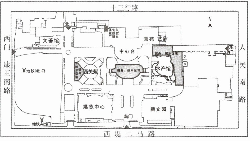 (1)该题考查方向判断能力,有指向标的地图,根据指向标判断方向。从图中可以看出,展览中心在南门的西北方向,因此,从南门进入后应该往西北方向走。