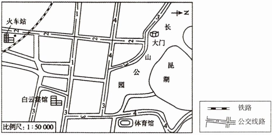 12.小明一家人乘坐火车到某市旅游,入住白云宾馆。下图为该市局部交通图。请协助小明解决下列问题。