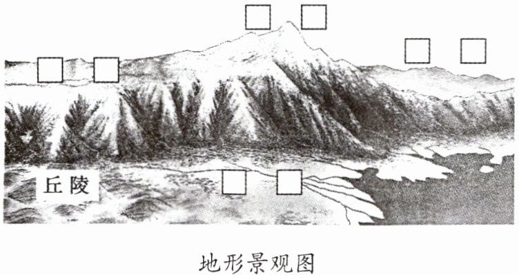 本题主要考查对五种基本地形类型的认识,以及根据地形景观图判断地形类型并进行标注的能力。解题的关键在于理解不同地形类型的特点,并能够观察景观图中地形的形态特征来进行判断。需要掌握的山地、高原、盆地、平原、丘陵这五种基本地形的特点如下:山地:海拔较高,一般在500米以上,坡度陡峻,沟谷较深。高原:海拔较高,一般在500米以上,地面坦荡,边缘比较陡峻。盆地:四周高,中间低。平原:海拔较低,一般在200米以下,地面平坦辽阔。丘陵:海拔较低,地面有起伏,坡度和缓,相对高度一般不超过200米。观察景观图,图中海拔较高、坡度陡峻、有山峰的部分为山地;在山地前方,海拔较高且相对平坦、边缘陡峻的部分为高原;图中中间低四周高的部分为盆地;远处海拔较低、平坦的部分为平原。