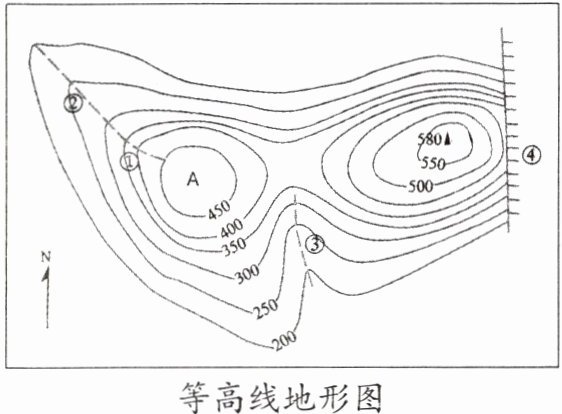 (5)图中______处可能找到小溪,判断的依据是______;且小溪的流向为自______(填方向)向______(填方向)流。