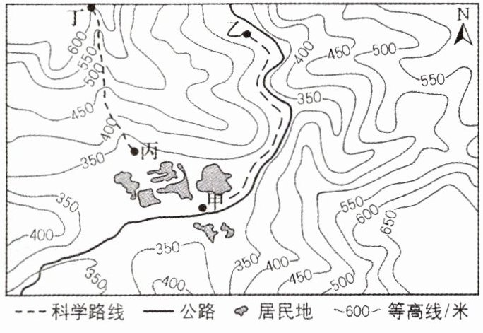 10.某地中学地理小组就近开展乡土地理研学活动,有“甲乙”和“丙丁”两条线路。右图示意当地等高线地形。结合所学知识,回答下列问题。