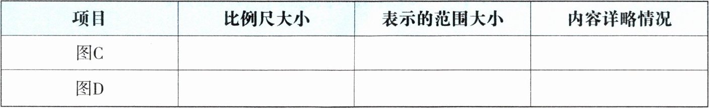 (3)根据图C和图D,分析比例尺与表示范围、内容详略的关系。