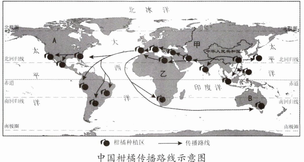 9.柑橘原产于我国,后来传播到世界各地。读下图,回答下列问题。