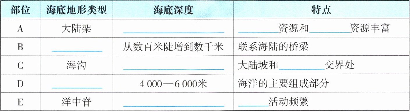 从海岸到大洋中部,海底地形具有明显的规律性。读“海底地形示意图”,完成下表。