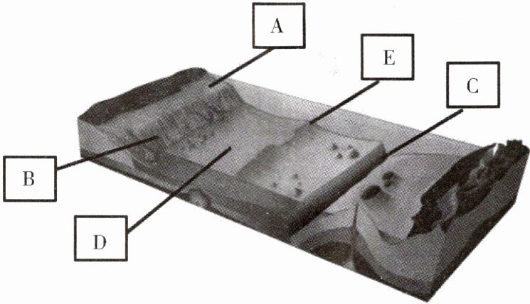 |B|大陆坡|从数百米陡增到数千米|联系海陆的桥梁|