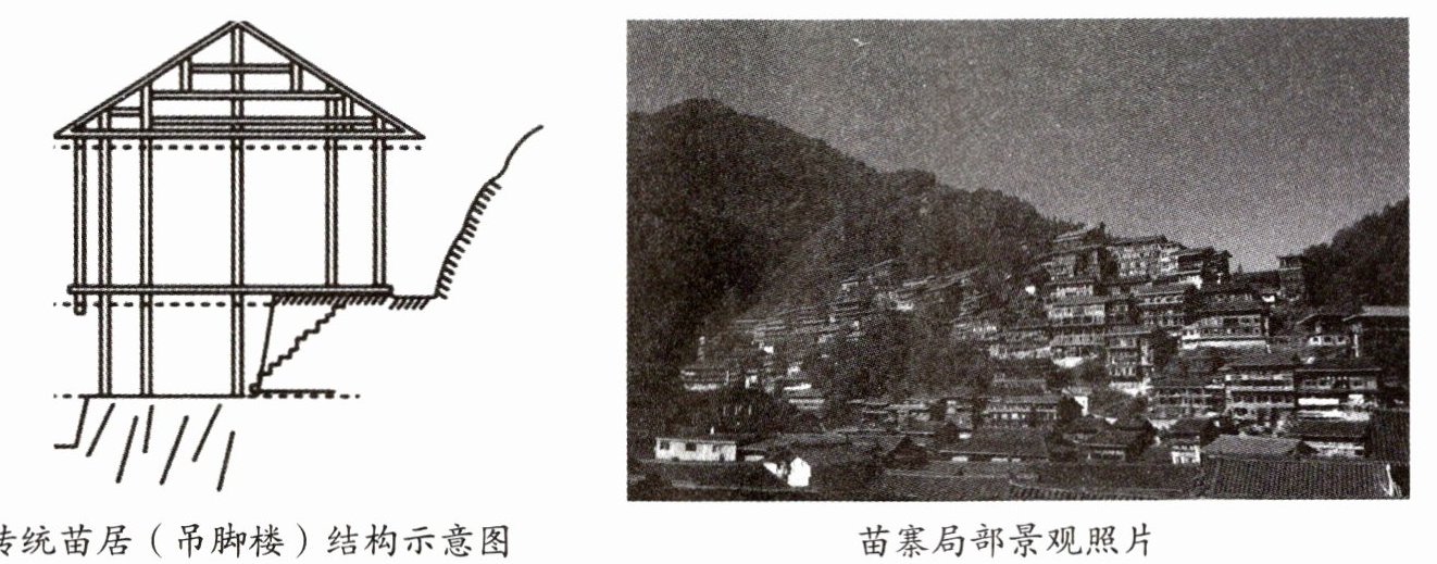 8.西江千户苗寨位于贵州省,是我国最大的苗族古村寨,层层落落的木质吊脚楼依山而建,呈梯状逐级抬升,与自然和谐共融,成为名副其实的“生态建筑”。读下页“传统苗居(吊脚楼)结构示意图”和“苗寨局部景观照片”,回答下列问题。