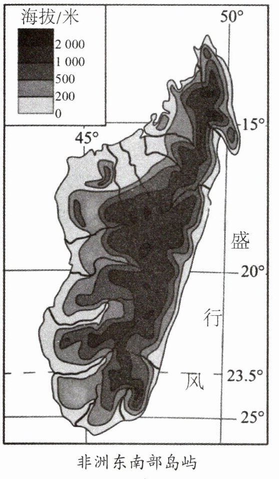读“非洲东南部岛屿马达加斯加岛的地形图”,完成6—7题。